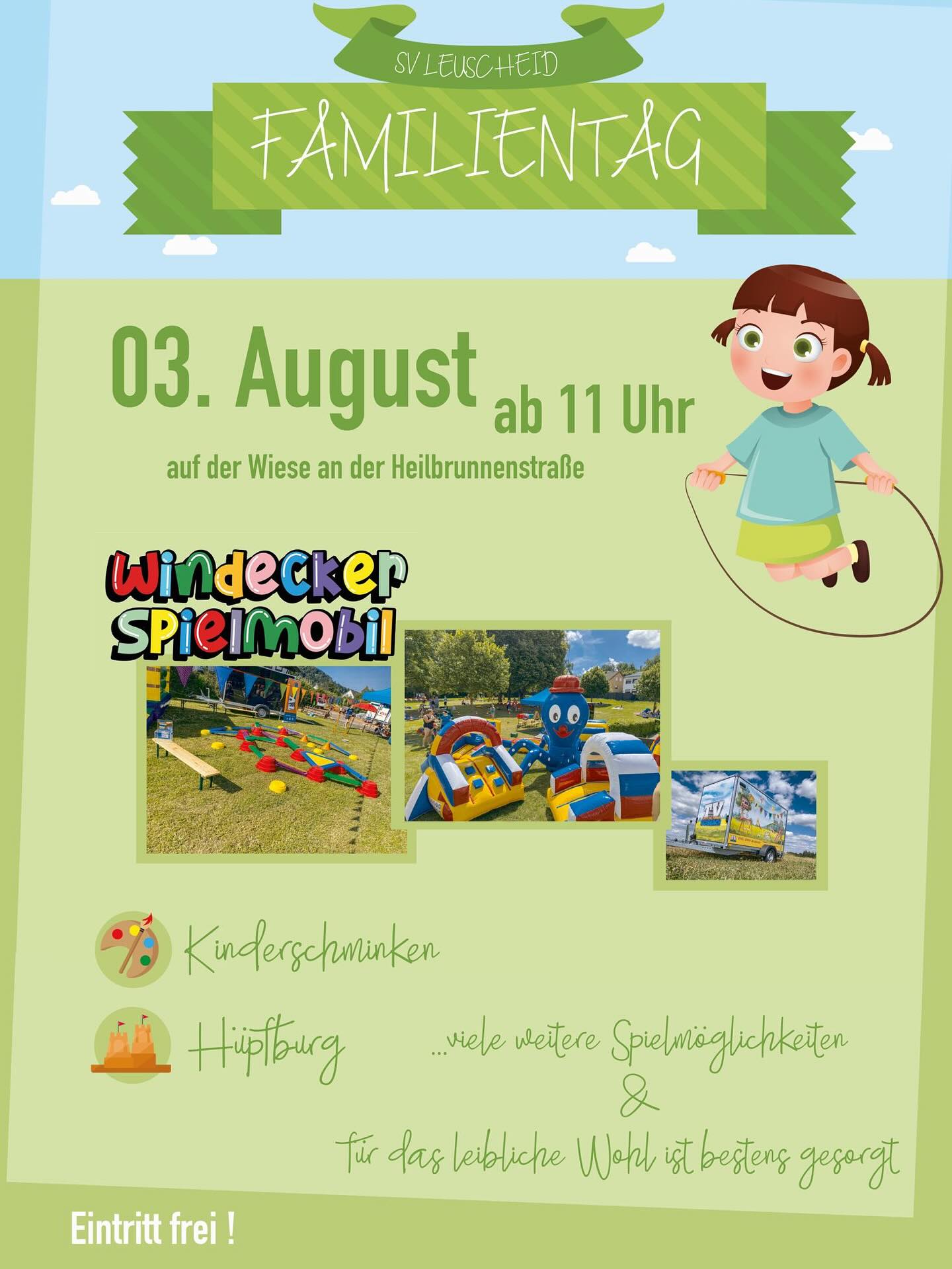 Der SV Leuscheid Familientag findet am Sonntag auf der Wiese an der Heilbrunnenstraße ab 11:00 Uhr statt. Neben dem Windecker Spielmobil, Kinderschminken und Hüpfburg wird es viele weitere Spielmöglichkeiten geben.