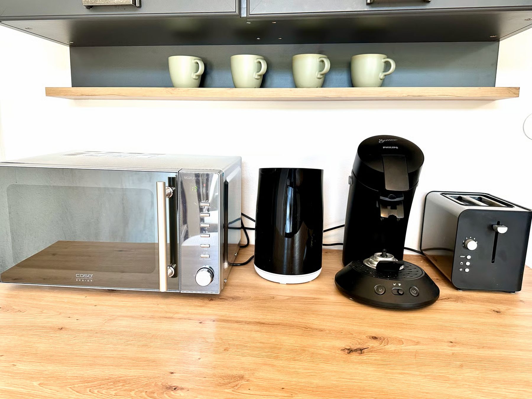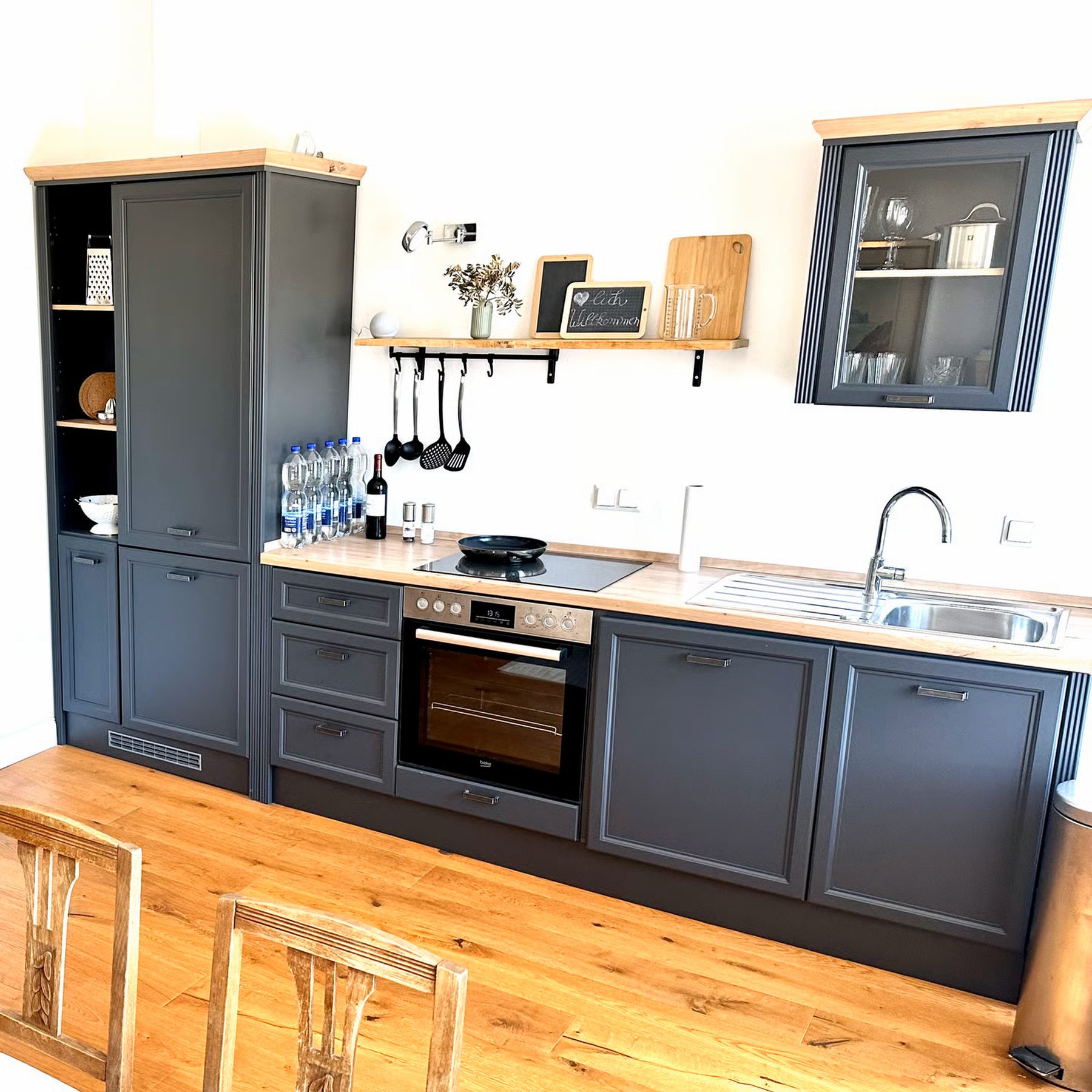 Voll ausgestattete große Küche mit allen Geräten, Geschirr und Zubehör
