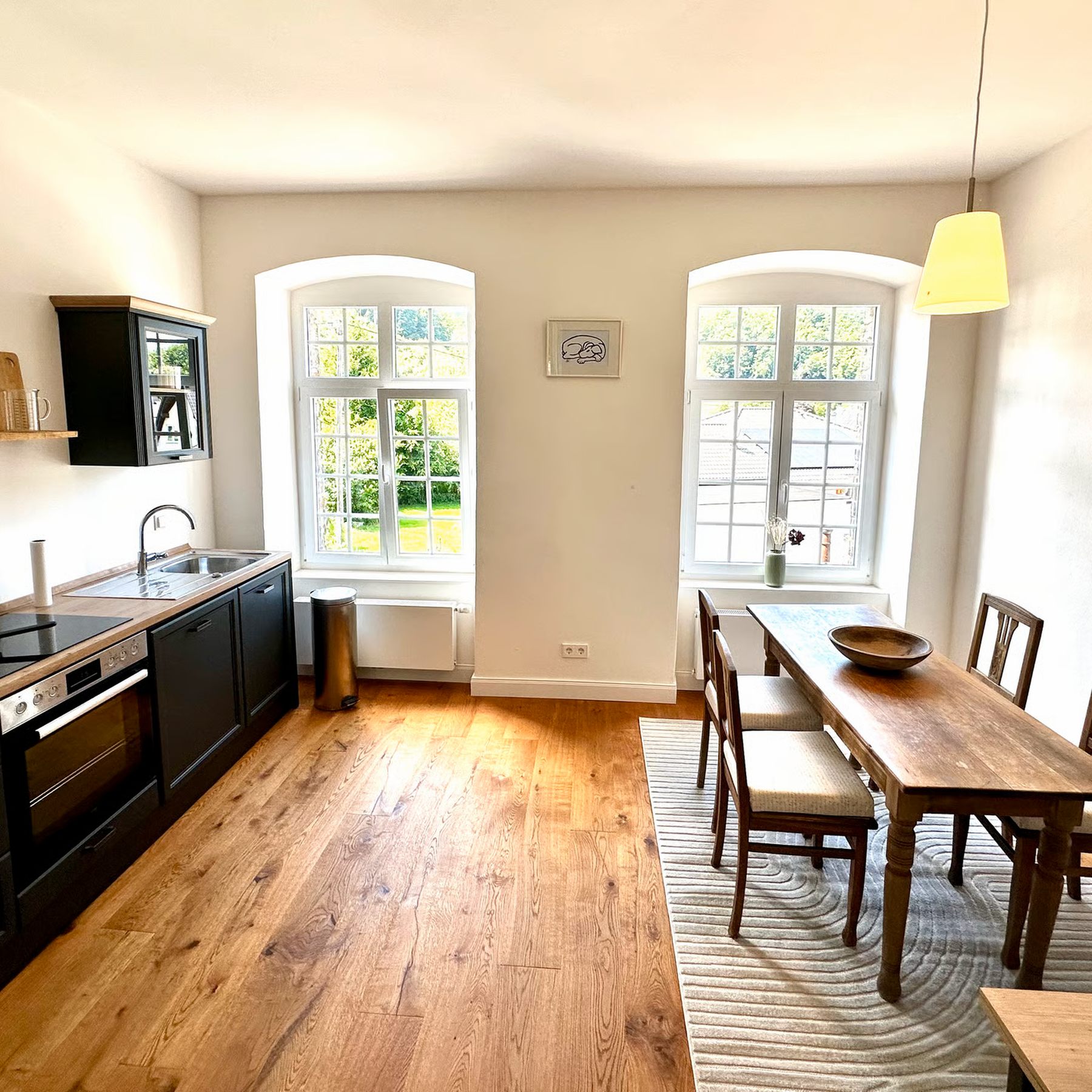 Küche ist gleichzeitig das gemütliche Esszimmer mit Ausblick ins Grüne