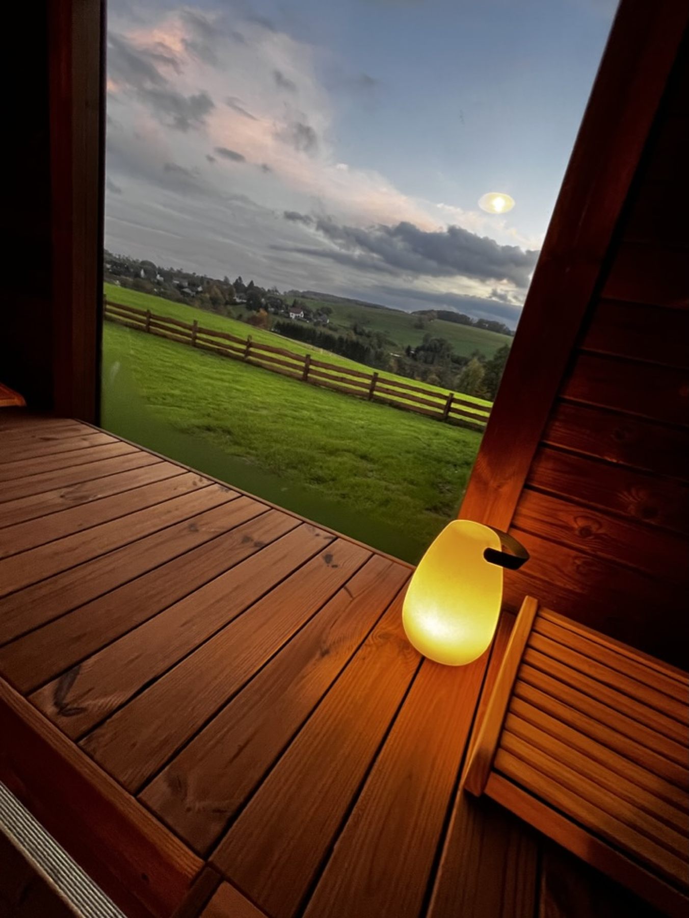 Unsere Außensauna mit Vorraum (Platz für bis zu 5 Personen) und Blick auf die Alpakaweiden kann für 50 € für 4 Stunden gebucht werden.