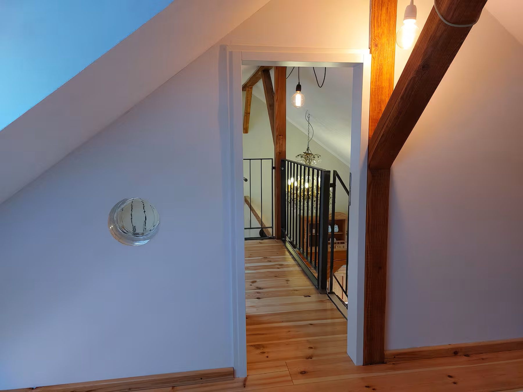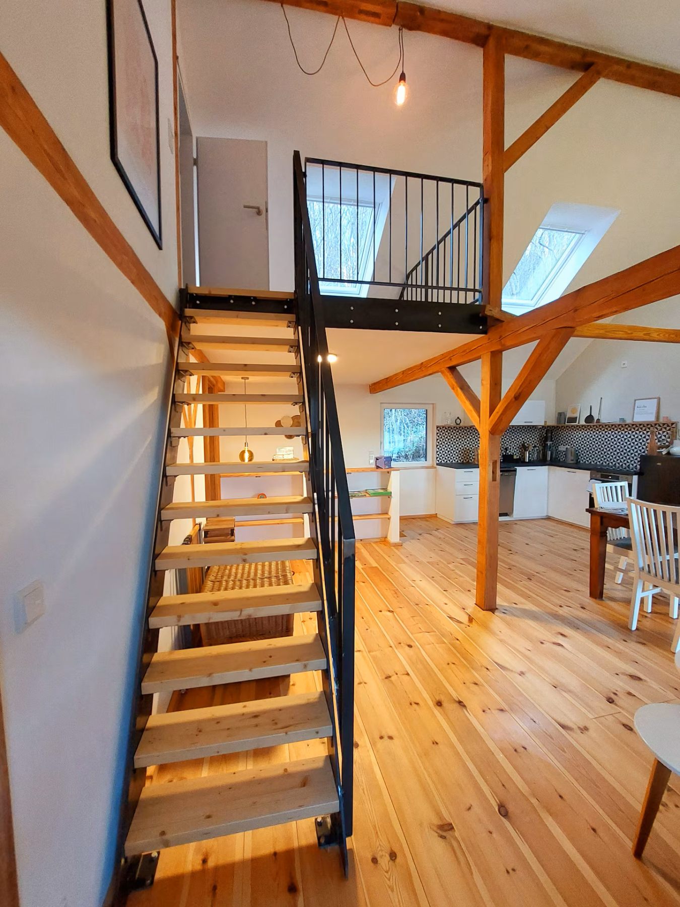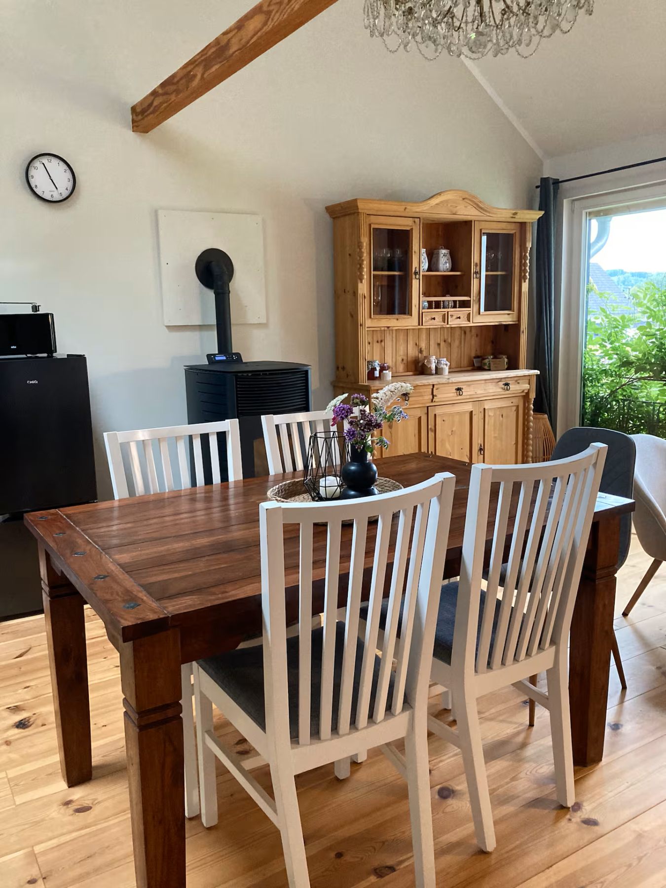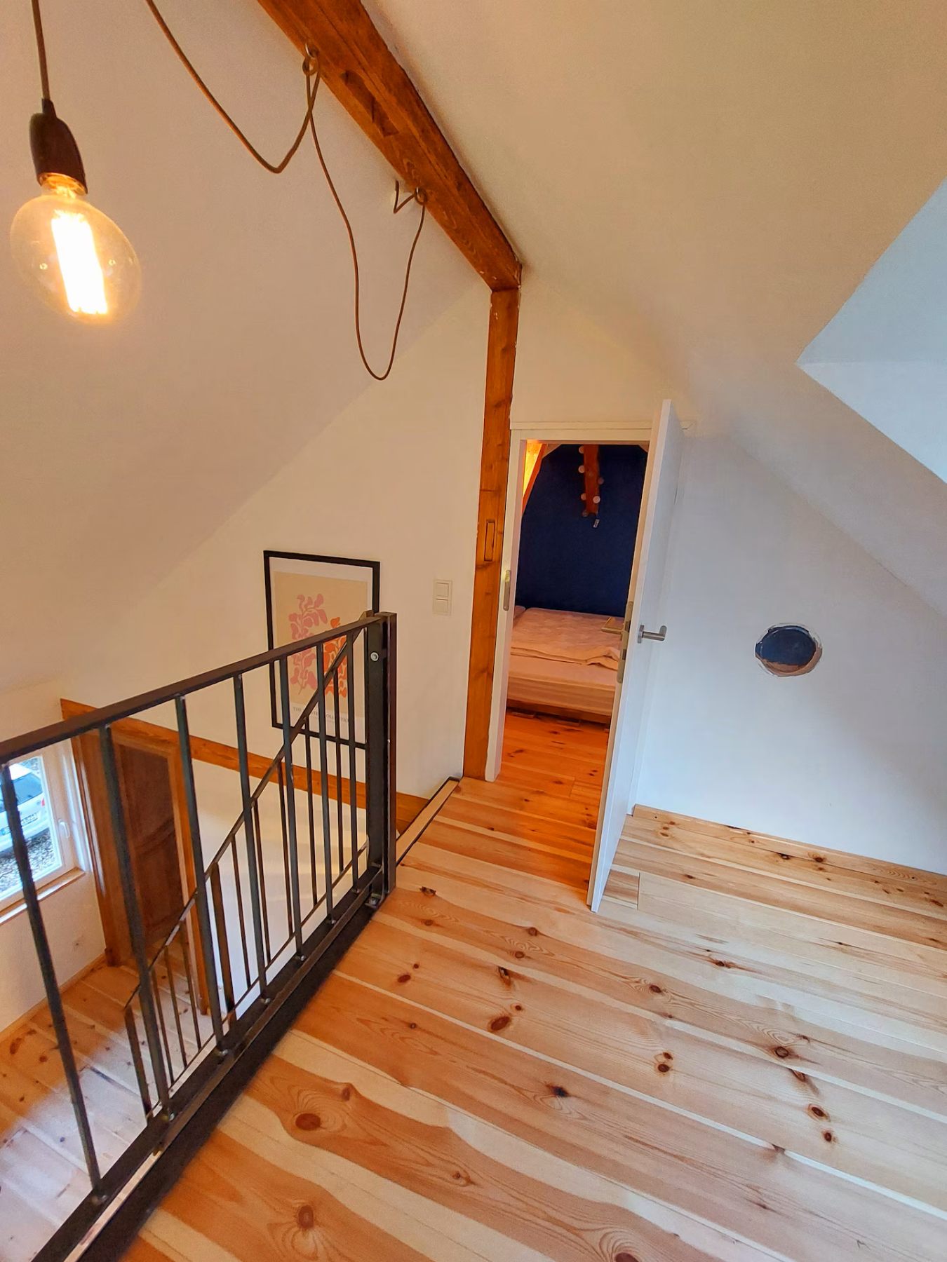 Die Ferienwohnung haben wir 2024 fertiggestellt. Dabei haben wir besonderen Wert auf nachhaltigen und ressourcenschonenden Materialeinsatz gelegt (ökologisches Dämmmaterial, Naturholzboden, aufgearbeitete alte Holztüren aus Wohnhaus).