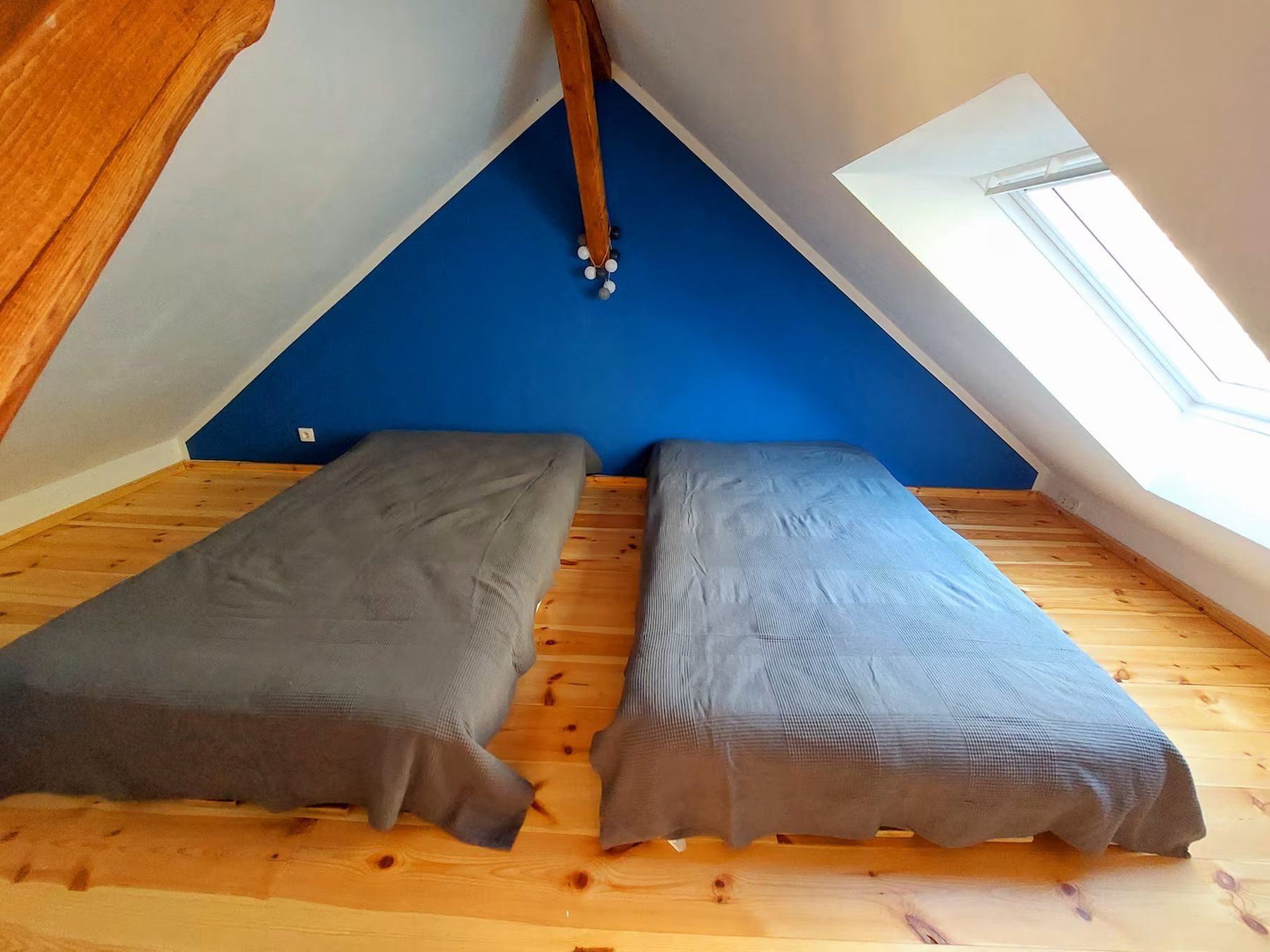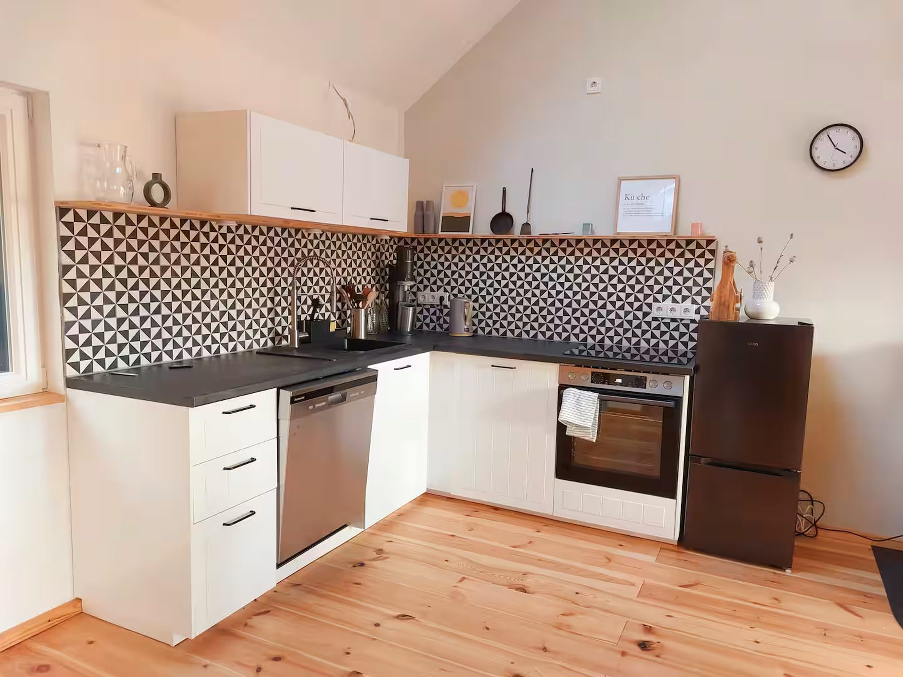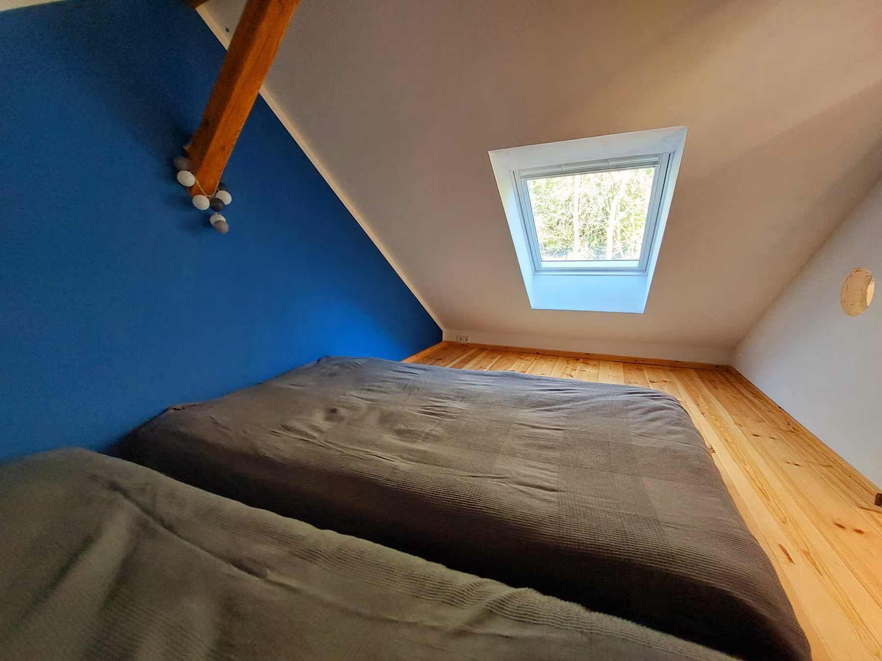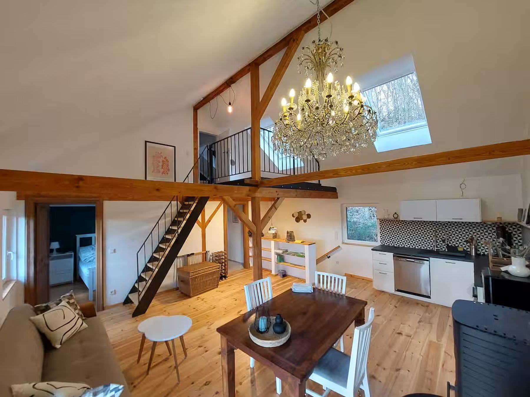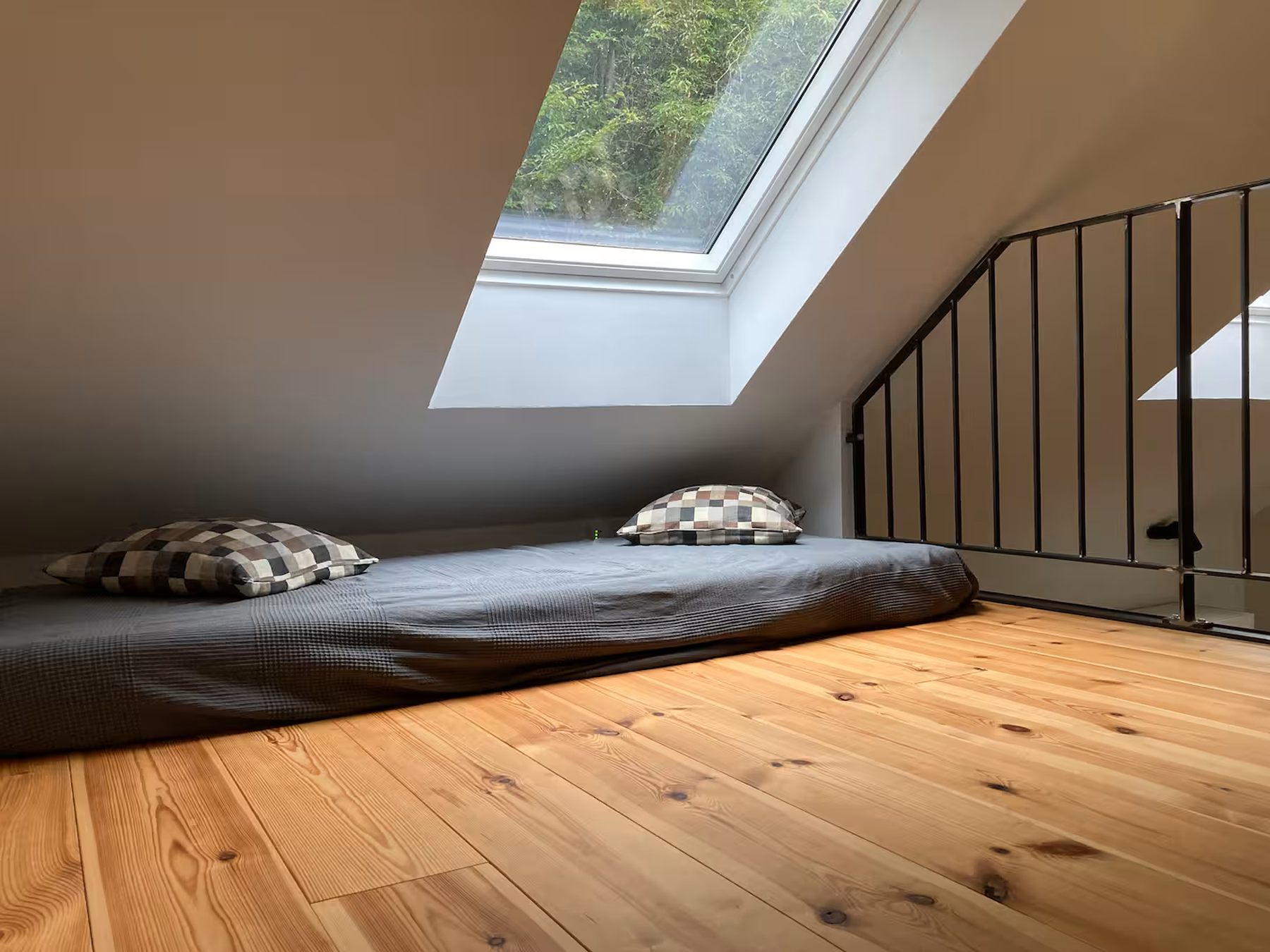 Auf rund 75 m² erwartet euch eine neu gebaute Ferienwohnung über 3 Etagen verteilt: vom Flur im EG – dort könnt ihr gerne Jacken und Schuhe lassen – erreicht ihr die 1. Etage mit geräumiger Wohnküche und gemütlichem Pellet-Ofen, Esstisch, Schlafcouch, Schlafzimmer mit Doppelbett (1,8m breit) sowie ein Badezimmer mit ebenerdiger Dusche. Von der Wohnküche aus führt euch eine Stiege zum Dachgeschoss zur Empore, von der aus ihr durch eine Wichteltür (Achtung: Kopfstoßgefahr!) in die geräumige Schlafkoje (2,1m hoch in der Mitte) kommt, die mit zwei flexibel verschiebbaren 1,2m-Betten ausgestattet ist. Von den Dachfenstern aus könnt ihr den Sternenhimmel und den Wald bestaunen. Beide Schlafzimmer sind komplett abdunkelbar.