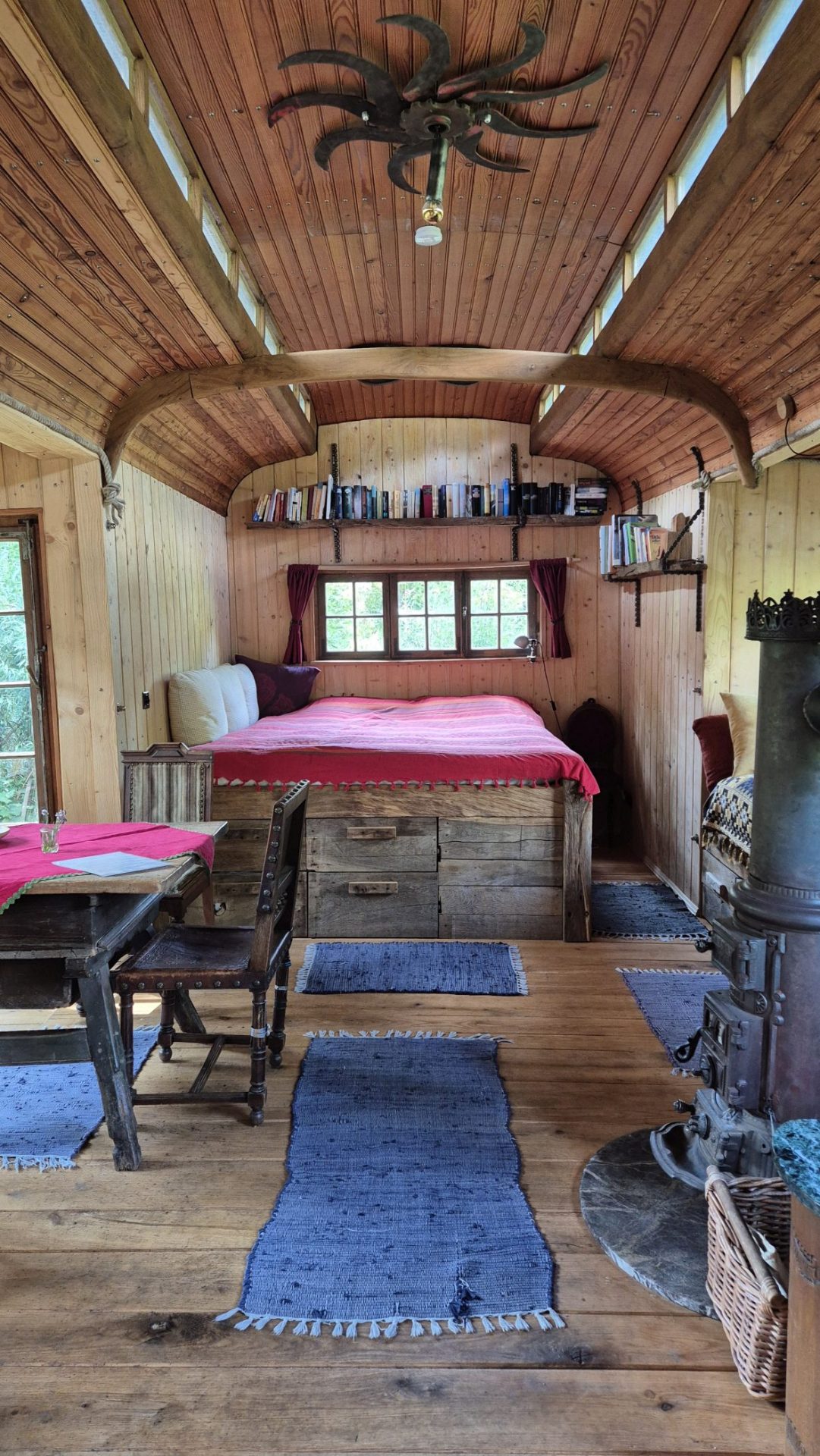Der Zirkuswagen wurde vom Eigentümer nach historischem Vorbild gebaut. Durch die beiden Erker und den angebauten Pavillon ist er sehr geräumig.