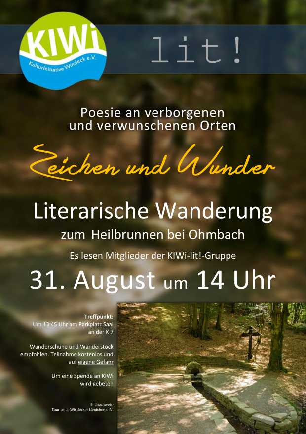 KIWi-lit! lädt zur nächsten literarischen Kurzwanderung ein: Poesie an verborgenen und verwunschenen Orten Heilbrunnen bei Ohmbach Thema: Zeichen und Wunder Sonntag, 31.08.2025 um 14 Uhr Treffpunkt und Parken: Parkplatz Saal an der K 7 Bitte beachten: Es wird um Anmeldung bis zum 24.08. gebeten. Vom Parkplatz Saal sind es noch ca. 2,5 Kilometer bis zum Heilbrunnen. Da es Ende August noch recht heiß sein kann, ist diese Strecke für den einen oder die andere vielleicht zu mühsam. Von Ohmbach aus sind es nur noch ca. 500 Meter, dort können aber nur maximal 4 Autos parken. Daher richten wir einen Shuttleservice… weiterlesen